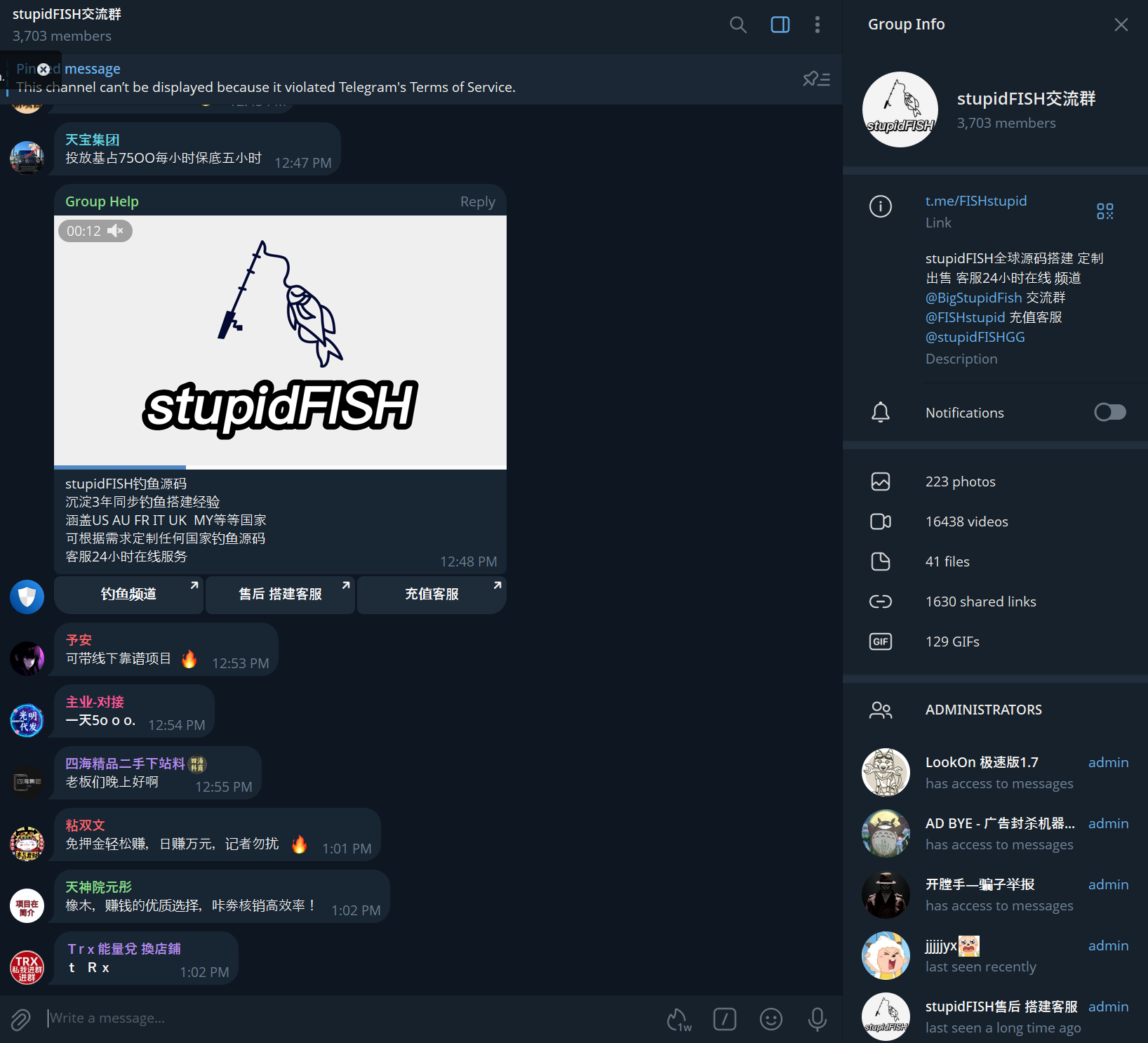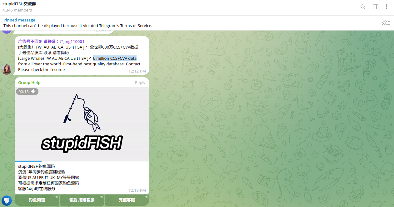 Several Telegram groups have been identified where the kit is being offered for sale. Notably, some of these groups have over 3,703 members, which may indicate that the kit is popular within the Chinese cybercriminal underground. Additionally, the information about the kit is provided only in Chinese and is likely intended for Chinese-speaking cybercriminals. There are at least three active groups related to the kit, and many more have been banned or suspended by Telegram due to violations of its Terms of Service (ToS).