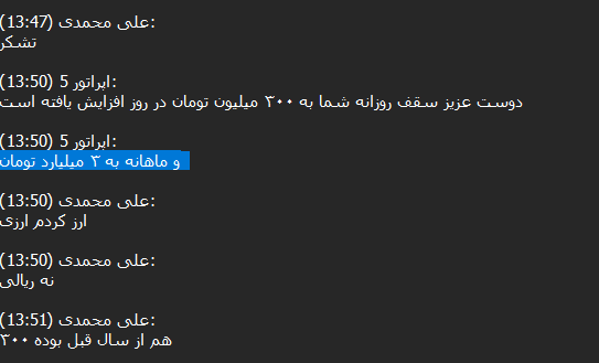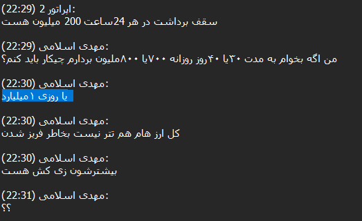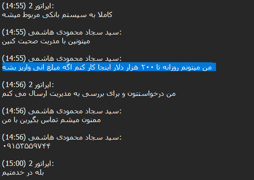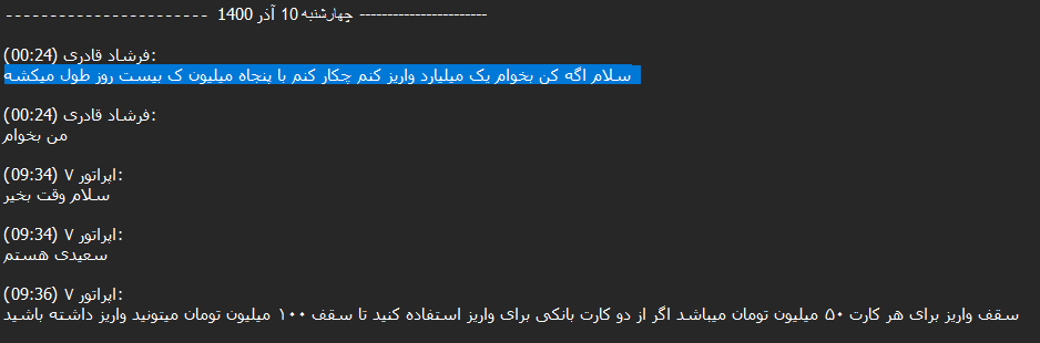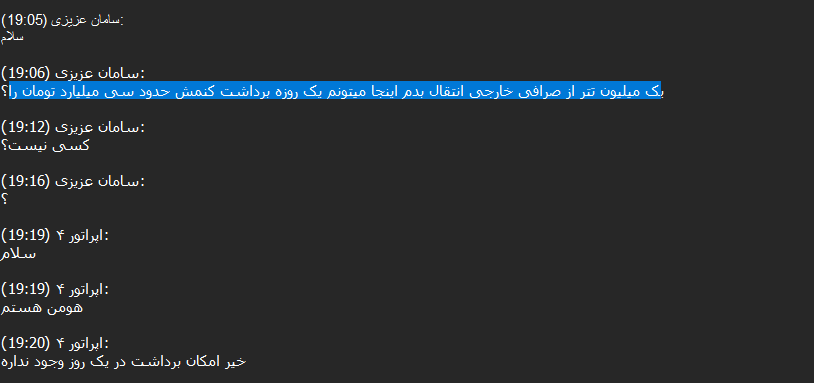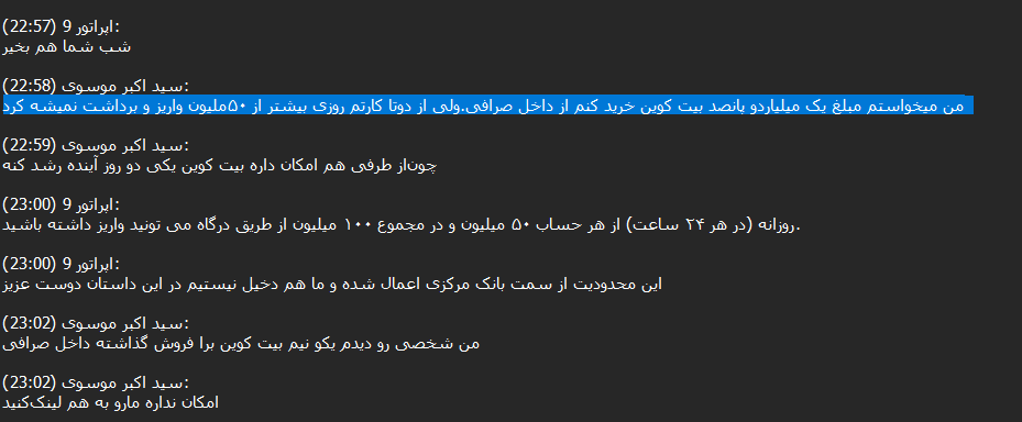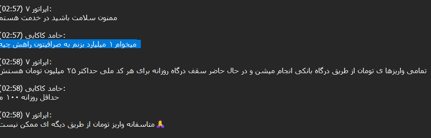 90% of these transactions are small, as Iranians are likely trying to purchase crypto such as Tether (USDT) to hold the value of their assets when the local currency gets devalued. However, we were able to track conversations with customer support in the DB where some actors were asking to transfer large amounts, ranging from $50,000 to $100,000 USD daily.