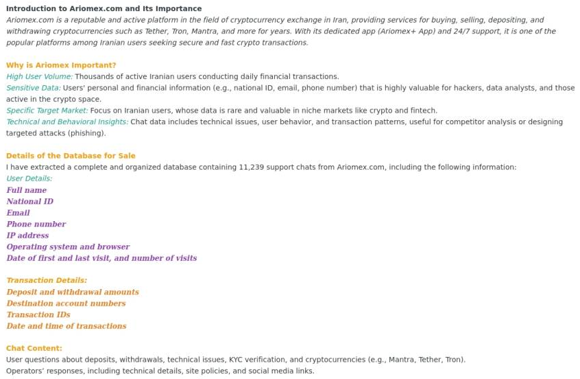 Resecurity acquired the Ariomex's database, one of the largest cryptocurrency exchange platforms in Iran. This report presents the findings of a structured analysis of the leaked database, which contains information about end users, their transactions, and the context surrounding their operations, covering the period from 2022 to 2025. Our analysis focused on sanctions exposure, financial crime risk indicators, cyber-enabled activity, cross-platform transaction flows and suspicious activity.