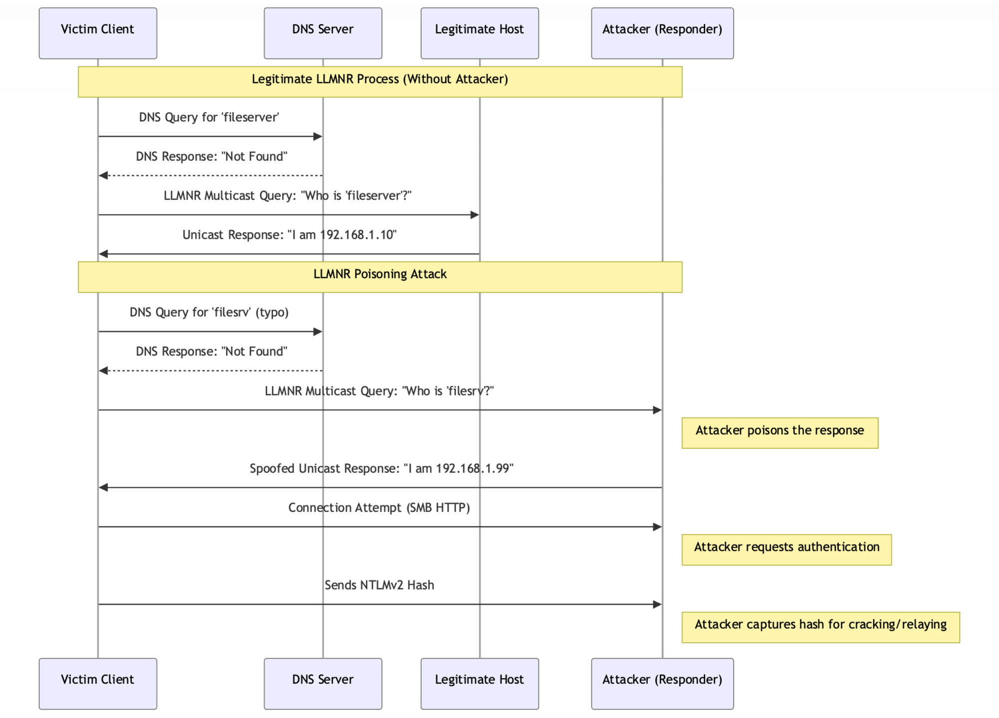A victim machine attempts to resolve a hostname (e.g., fileserver01.local) that DNS cannot resolve. The system falls back to broadcasting an LLMNR request across the local network.