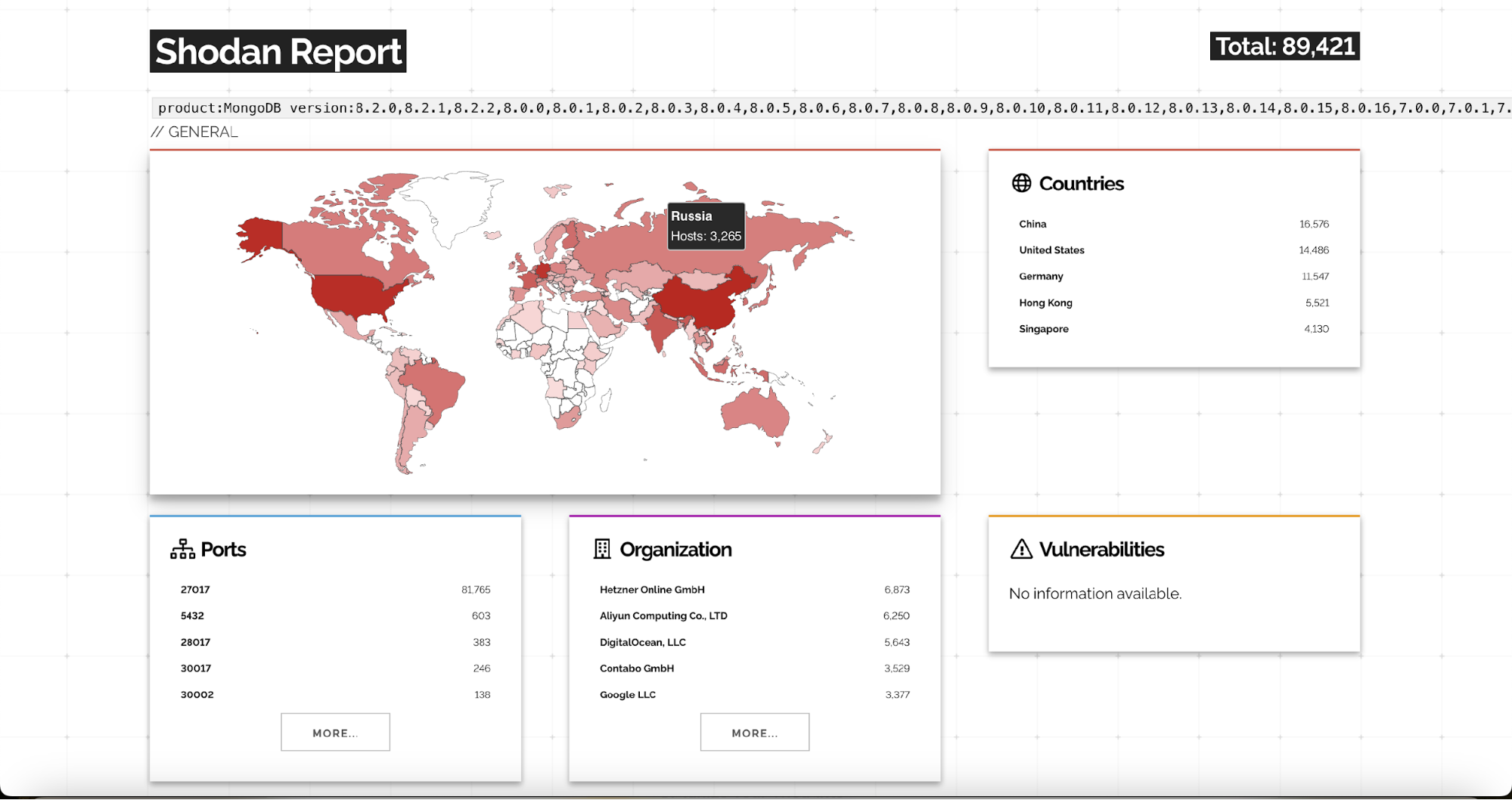 The concentration of vulnerable MongoDB instances on large cloud and hosting providers highlights the risk of misconfiguration at scale. Attackers can rapidly enumerate and target these environments using internet-wide scanning platforms, enabling automated exploitation, data exposure, and service compromise across multiple tenants.