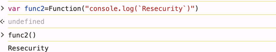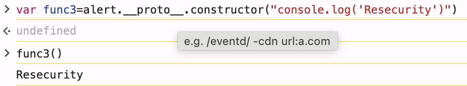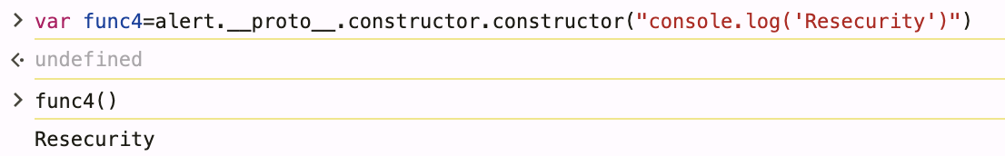 var func3=alert.__proto__.constructor("console.log('Resecurity')")