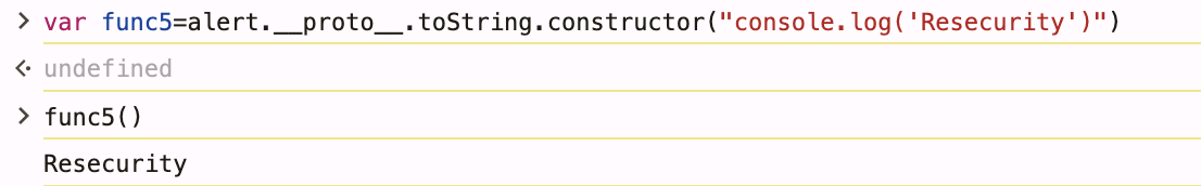 5var func5=alert.__proto__.toString.constructor("console.log('Resecurity')")
