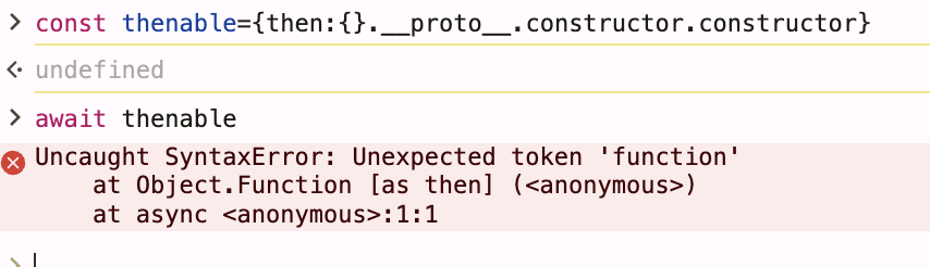 Hijacks the .then property to point to React's internal Chunk.prototype.then method instead of the dangerous global Function() constructor.