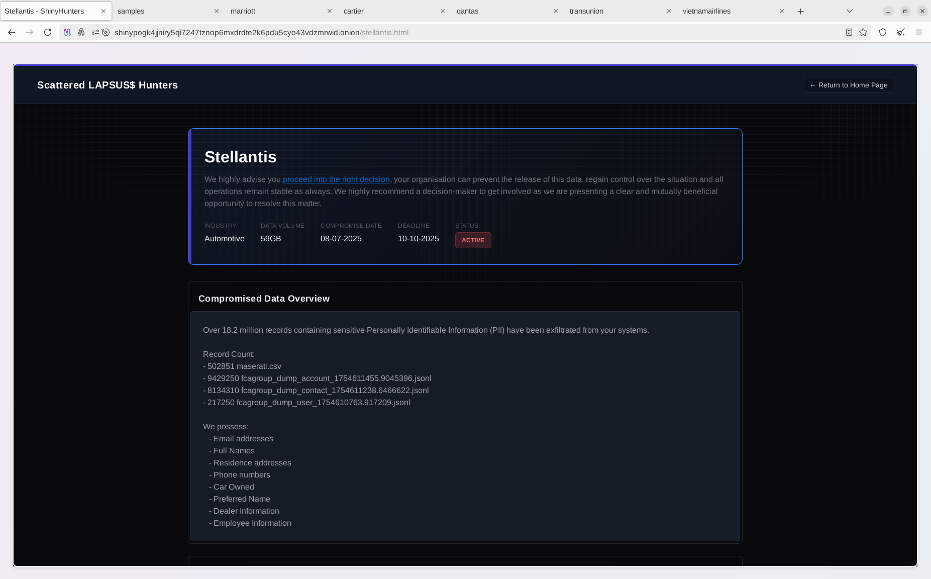 The listing on the Data Leak Site (DLS) includes references to the most recent victims, including Stellantis, the automotive giant that disclosed a data breach affecting its North American customers a few weeks ago (September 21, 2025). This incident followed an attack on the British luxury carmaker Jaguar Land Rover, which severely disrupted its retail and production activities.