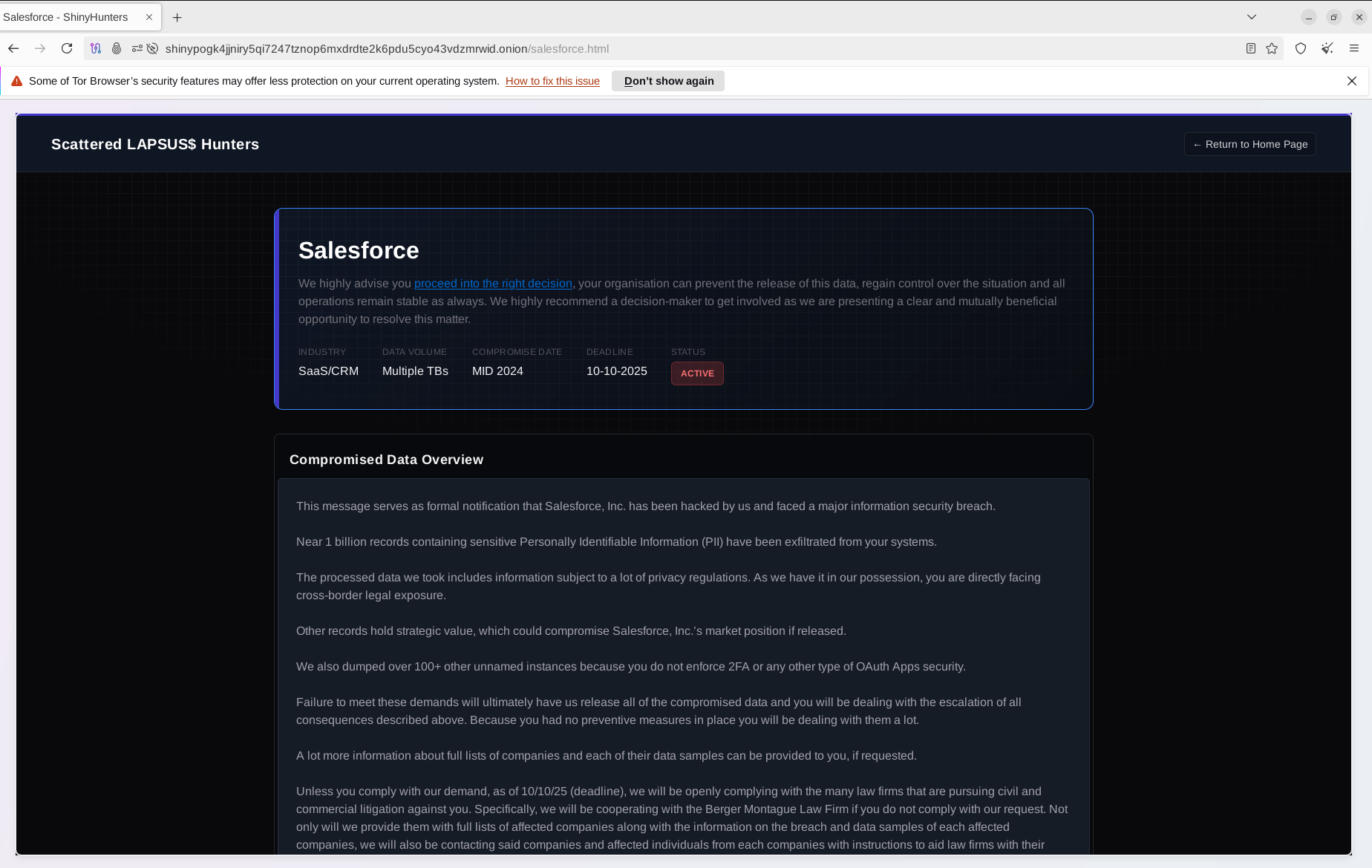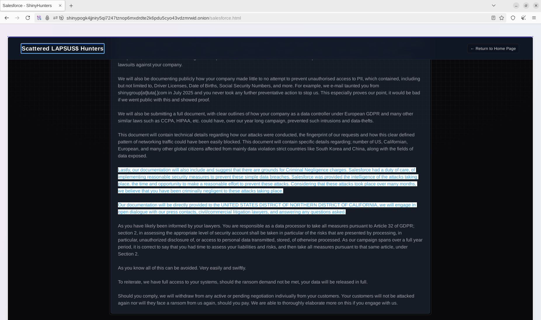 The threat actors stated they attempted to contact Salesforce earlier but were unable to negotiate terms to prevent disclosure. Similar to the tactics of other ransomware groups—for example, targeting EU-based victims to ensure compliance with GDPR—the group threatened to report evidence of the data breach to regulators, which could result in "criminal negligence charges" against the company.