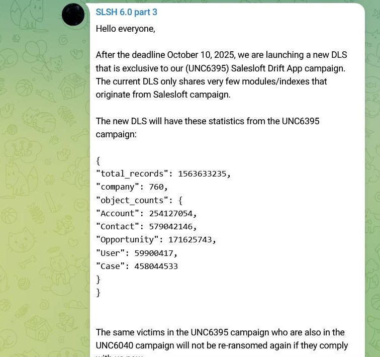 The notorious ransomware collective indicated that the victims originate from previous campaigns, including UNC6395 (related to Salesforce / Salesloft Drift App exploitation) and UNC6040. They also promised not to "re-ransom" the victims if there is cooperation.