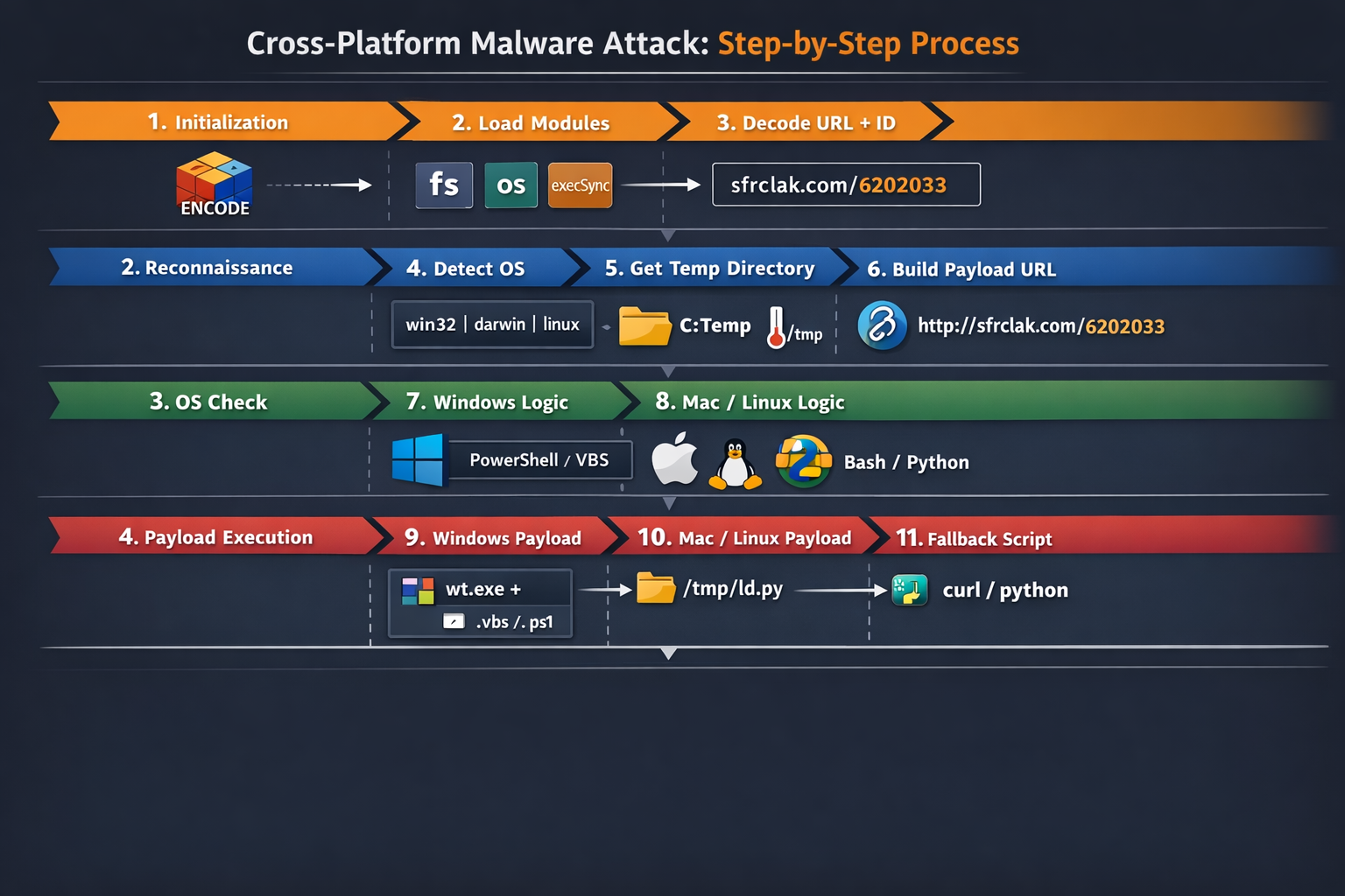 The diagram provides a complete visual overview of a cross-platform malware attack, highlighting how obfuscation, environment detection, dynamic payload building, and OS-specific execution combine to achieve stealthy infection across Windows, macOS, and Linux systems.